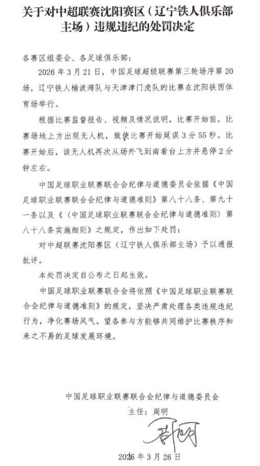 对中超联赛沈阳赛区(辽宁铁人俱乐部主场)予以通报批评。